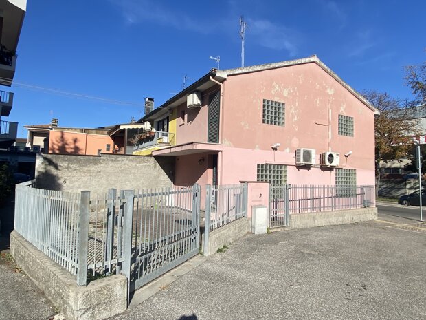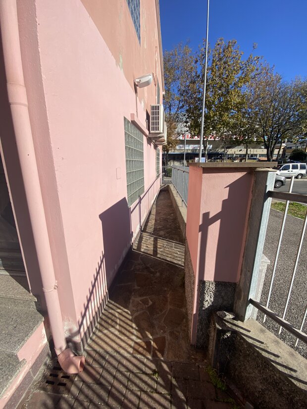 La posizione è un vero punto di forza: l'immobile gode di una visibilità e di un'esposizione eccellenti su tre lati, affacciandosi direttamente su Via Flaminia, Via San Gaudenzo e sull'esclusiva corte privata. L'intera proprietà è completamente recintata e include un comodo cortile esterno di proprietà, ideale come parcheggio riservato o spazio esterno privato.